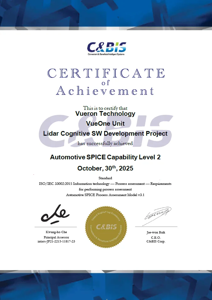 최근, 뷰런은 이 A-SPICE 평가에서 CL2 인증을 획득했습니다. 이는 단순한 기술력의 증명에 그치지 않고, 국제 표준에 맞춘 프로젝트 운영 역량을 공식적으로 인정받았다는 뜻입니다.