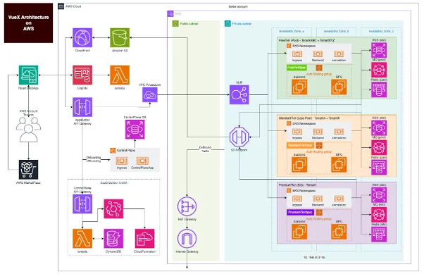 고객 데이터와 AI 워크로드는 Application Plane에서 실행됩니다. 뷰엑스의 여러 테넌트들을 위한 서비스를 진행하기 위해, AWS의 관리형 Kubernetes 서비스인 Amazon Elastic Kubernetes Service(EKS) 를 사용하며, EKS는 SaaS 서비스를 구축하는 최적의 환경을 제공합니다. 각 테넌트 워크로드와 관련 테넌트 관련 오브젝트들은 Namespace 단위로 격리됩니다. 테넌트에 대한 리소스는 티어(구독 플랜)에 따라 다른 방식으로 할당되며, 각 티어별 리소스는 Auto Scaling Group과 GPU 노드를 통해 라벨링/추론 워크로드를 수평 확장됩니다.